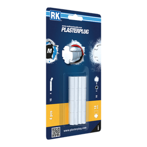 Time-saving wall repair method for drywall. The empty space behind is no longer a problem. RK PLASTERPLUG is an actual repair solution that restores a drywall almost to its former state unlike traditional cosmetic repairs. The end result is a perfectly finished flat surface, which can be drilled same as new walls.